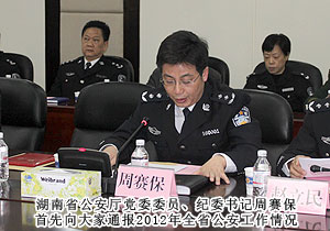 湖南省公安廳黨委委員、紀(jì)委書記周賽保首先向大家通報(bào)了2012年全省公安工作情況,他指出,剛剛過去的2012年,是公安工作任務(wù)艱巨繁重的一年。全省公安機(jī)關(guān)和廣大民警在省委、省政府和公安部的堅(jiān)強(qiáng)領(lǐng)導(dǎo)下主動(dòng)迎難而上,忠實(shí)履責(zé),無私奉獻(xiàn),有力地維護(hù)了全省社會(huì)政治穩(wěn)定和治安平穩(wěn)。根據(jù)民調(diào)中心調(diào)查顯示,2012年公眾對(duì)社會(huì)治安、公安隊(duì)伍建設(shè)的整體評(píng)價(jià)比2011年分別提升了2.196分、4.29分。警務(wù)調(diào)查顯示,人民群眾對(duì)警務(wù)工作的滿意率達(dá)98.94%,受到了省委、省政府和公安部的充分肯定。