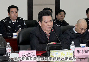 會(huì)上,省廳特邀監(jiān)督員座談發(fā)言踴躍。與會(huì)的各位特邀監(jiān)督員在充分肯定公安工作取得的成績和高度贊揚(yáng)公安民警隊(duì)伍的同時(shí),也紛紛各抒己見、踴躍發(fā)言。從各自不同的職業(yè)特點(diǎn)和工作實(shí)際,談體會(huì)、談感受,提建議、提希望,真誠表達(dá)對(duì)公安工作、公安隊(duì)伍建設(shè)的期待和厚望。作為新當(dāng)選的監(jiān)督員,胡國安董事長表示:從2008年首次受聘為湖南省地方稅務(wù)特邀監(jiān)察員開始,2012年被受聘為湖南省紀(jì)委、省監(jiān)察廳“機(jī)關(guān)效能建設(shè)和優(yōu)化經(jīng)濟(jì)發(fā)展環(huán)境監(jiān)督測(cè)評(píng)員”,對(duì)特邀監(jiān)督員這個(gè)身份有一種厚重的使命感。這個(gè)聘書是沉甸甸的,跟人大代表、政協(xié)委員的身份一樣,不僅是一種光榮,更肩負(fù)著普通民眾的矚托,伴隨著重要責(zé)任。我一定不辜負(fù)省公安廳黨委的希望,不辜負(fù)孫書記的重托,發(fā)揮好監(jiān)督、橋梁和參謀作用,做一名稱職的監(jiān)督員、充分發(fā)揮好監(jiān)督、橋梁和參謀作用,為公安工作和隊(duì)伍建設(shè)多做貢獻(xiàn)。