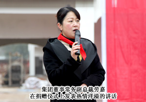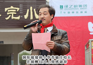 洞陽鎮(zhèn)矮橋小學(xué)蘇敏莊校長在捐贈儀式上致感謝辭,他首先代表學(xué)校全體師生,對綠之韻集團捐贈課桌椅和御寒衣服的仁義大愛表示衷心的感謝。他說,我是今年下半年才來到矮橋小學(xué)的,在接到任命之前,沒來過這所學(xué)校,當(dāng)來到這里后,我被這個學(xué)校的陳舊所震撼??吹竭@些,我都想退出,可退出只能當(dāng)想法,唯一的辦法就是全身心的投入工作,把學(xué)校建設(shè)好,并呼吁匯集社會力量捐資助學(xué),興資辦學(xué)。綠之韻集團董事長胡國安先生、董事常務(wù)副總裁勞嘉女士,他們是具有遠(yuǎn)見卓識而又充滿博愛心腸的慈善企業(yè)家。綠之韻集團,由小而大,聲譽日隆,這固然和他們先進的經(jīng)商理念相關(guān),但我覺得這更和他們心宅仁厚,廣結(jié)善緣密不可分。綠之韻集團對我校捐贈桌椅、衣物、學(xué)習(xí)用品等物資,施以援手,奉獻愛心,直接受益的是我的學(xué)生們,直接受益的是洞陽鎮(zhèn)教育事業(yè)。作為一校之長的我,更要勤奮工作,不辜負(fù)綠之韻集團和社會各界對矮橋小學(xué)的厚望,創(chuàng)造出更加輝煌的業(yè)績。
