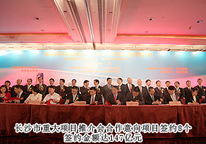 香港長沙商會成立儀式后,長沙市舉行了重大項目推介會。長沙高新區(qū)、經開區(qū)、武廣高鐵新城和長沙大河西先導區(qū)等四大作專題推介。長沙市根據香港向內地產業(yè)轉移的趨勢和香港自身的產業(yè)特色,重點圍繞其國際金融、創(chuàng)新科技、環(huán)保技術、高端會展、高效物流、專業(yè)服務、影視娛樂、推廣平臺等產業(yè)優(yōu)勢,推介長沙市20個的優(yōu)質招商項目。會上合作意向項目簽約8個,簽約金額達147億元。