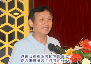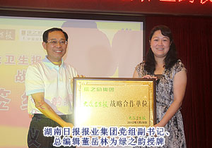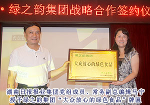 簽約儀式由湖南日報報業(yè)集團(tuán)黨組成員、副總編輯盛忠主持。會上,湖南日報報業(yè)集團(tuán)黨組副書記、總編輯董岳林為綠之韻集團(tuán)授予“大眾衛(wèi)生報?綠之韻集團(tuán)戰(zhàn)略合作單位”牌匾。湖南日報報業(yè)集團(tuán)黨組成員、常務(wù)副總編輯馬寧授予綠之韻集團(tuán)“大眾放心的綠色食品”牌匾,綠之韻集團(tuán)董事常務(wù)副總裁勞嘉代表集團(tuán)接受牌匾。