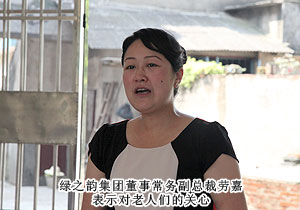 一進(jìn)敬老院,在院子的陰涼處,老人們?nèi)齼蓛傻?,安安靜靜的坐著??吹街驹刚叩牡絹恚先藗兡樕隙悸冻隽藸N爛的笑容。洞陽鎮(zhèn)鎮(zhèn)長戴奉仙向大家介紹了敬老院的基本情況,并對(duì)綠之韻人的愛心捐贈(zèng)表示感謝。綠之韻集團(tuán)董事常務(wù)副總裁勞嘉為老人們送上了愛心物資,并表示:綠之韻慈善基金將長期關(guān)注“孤寡老人”的問題,將這樣的愛心活動(dòng)繼續(xù)做下去,大力弘揚(yáng)中華民族尊老敬老愛老的美德,讓更多老年人擁有一個(gè)幸福的晚年。
