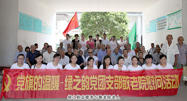 2012年8月3日上午,綠之韻黨支部又?jǐn)y手瀏陽市洞陽鎮(zhèn)政府舉辦了主題為“黨旗的溫暖”的敬老院慰問活動(dòng),綠之韻集團(tuán)董事常務(wù)副總裁勞嘉、黨支部書記許達(dá)仲帶領(lǐng)20名綠之韻黨團(tuán)員代表、綠之韻愛心志愿者來到洞陽鎮(zhèn)敬老院看望孤寡老人,為老人們送上愛心物資和關(guān)懷。