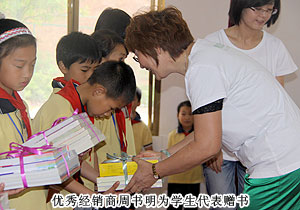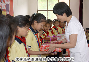 綠之韻集團(tuán)董事常務(wù)副總裁勞嘉、黨支部書記許達(dá)仲、慈善基金負(fù)責(zé)人蔣文,湖南地區(qū)優(yōu)秀經(jīng)銷商代表周書明、羅新春、夏曉玲等出席捐贈(zèng)儀式,用精美的圖書為孩子們打開知識(shí)世界的一扇窗。