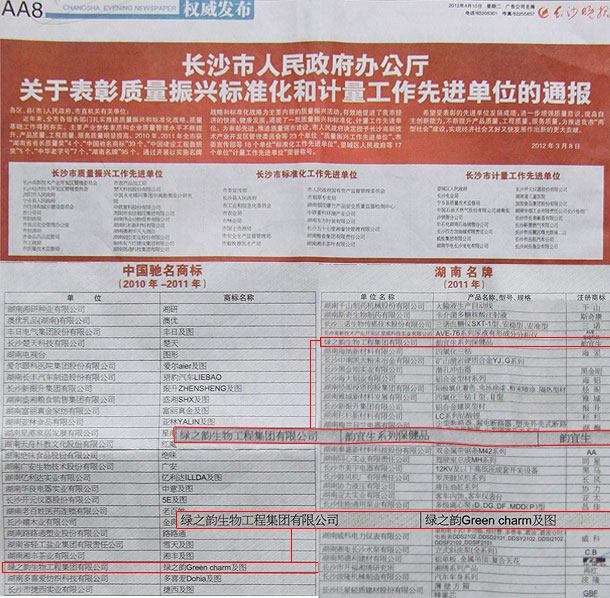 2012年4月10日,長(zhǎng)沙市人民政府質(zhì)量工作會(huì)議成功召開。長(zhǎng)沙市人民政府副市長(zhǎng)何寄華,長(zhǎng)沙市質(zhì)量監(jiān)督局局長(zhǎng)陳曙光、副局長(zhǎng)周笑春出席會(huì)議并發(fā)表重要講話。會(huì)上,綠之韻韻宜生系列產(chǎn)品榮獲“湖南名牌”榮譽(yù)稱號(hào),是繼“韻宜生”商標(biāo)榮獲“湖南省著名商標(biāo)”后的又一重大榮譽(yù)。