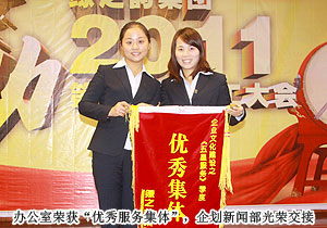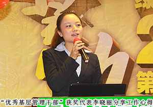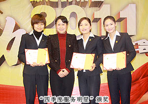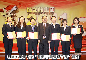 會議最激動人心的時刻屬頒獎環(huán)節(jié),為表彰過去一年里兢兢業(yè)業(yè)、踏實肯干、辛勤付出的優(yōu)秀員工,“四季度服務明星”“優(yōu)秀服務集體”“年度優(yōu)秀職員”“年度優(yōu)秀基層管理干部”“年度優(yōu)秀中層管理干部”等獎項相繼頒發(fā)。同時,通過全體同事的投票選舉,“陽光天使”獎項首次頒發(fā),樂于助人、團結(jié)同事的辦公室李倩婷榮獲該稱號。透過每一位獲獎代表的分享,他們的工作態(tài)度:忠誠、敬業(yè)和專業(yè),無不讓人心生敬意。胡國安董事長在總結(jié)發(fā)言中表示:感謝每一位員工不離不棄的追隨,在綠之韻邁入第九個發(fā)展年頭之際,要向每一位同仁道一聲誠摯的感謝。綠之韻在2011年從各方面夯實著基礎,為2012年的突破做好了充足的準備,“蓄”為積淀,“力”為爆發(fā),只要全體綠之韻人上下一心,同心同步,我們定能龍騰海天,再創(chuàng)新高!
