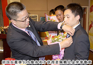 “綠之韻五年服務英才”是此次大會最受關注的獎項,也是綠之韻集團對員工的高度認可和最好的獎勵。胡國安董事長為獲獎的24名服務英才頒發(fā)香港周大福珠寶公司特約設計師量身定做的、鐫刻獲獎者名字的足金榮譽徽章和獎金。五年來,他們與綠之韻同舟共濟、艱苦創(chuàng)業(yè),在崗位上勤勤懇懇、任勞任怨,參與、見證綠之韻一路走來的發(fā)展歷程,將綠之韻的成長歲月與自己的青春年華融為一體,無論遇到任何環(huán)境的改變,從未改變他們的熱情、闖勁,一直在綠之韻發(fā)展的道路上傾情奉獻!