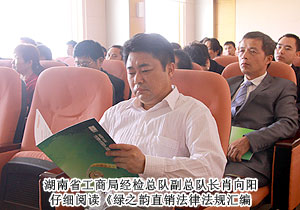 為紀(jì)念國務(wù)院頒布《直銷管理?xiàng)l例》和《禁止傳銷條例》實(shí)施六周年,進(jìn)一步規(guī)范直銷市場(chǎng)監(jiān)管,加強(qiáng)法律法規(guī)的宣傳力度,確保綠之韻做到規(guī)范自律、永續(xù)發(fā)展,2011年10月22日上午,在湖南省工商部門的指導(dǎo)下,綠之韻集團(tuán)紀(jì)念兩個(gè)《條例》學(xué)習(xí)會(huì)成功召開。湖南省工商行政管理局經(jīng)檢總隊(duì)副總隊(duì)長肖向陽擔(dān)任主講嘉賓,綠之韻集團(tuán)董事常務(wù)副總裁勞嘉、總裁助理兼企劃教育總監(jiān)何健與總部員工、優(yōu)秀經(jīng)銷商、低碳事業(yè)部代表共同參加了此次學(xué)習(xí)會(huì)議。