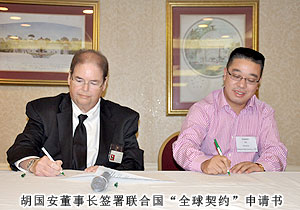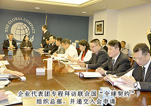 考察過(guò)程中,企業(yè)家代表團(tuán)一行專(zhuān)程拜訪(fǎng)了聯(lián)合國(guó)“全球契約”組織總部,與聯(lián)合國(guó)“全球契約”總干事喬治?科爾進(jìn)行了友好、親切的會(huì)見(jiàn)。綠之韻集團(tuán)、楚天科技、佳樂(lè)實(shí)業(yè)等湖南省15家民營(yíng)企業(yè)現(xiàn)場(chǎng)向該組織遞交了入會(huì)申請(qǐng)。“全球契約”是一種思路和價(jià)值觀,由前聯(lián)合國(guó)秘書(shū)長(zhǎng)安南首倡議,潘基文秘書(shū)長(zhǎng)繼續(xù)推動(dòng)。該契約旨在鼓勵(lì)全球企業(yè)與聯(lián)合國(guó)機(jī)構(gòu)、勞工組織和民間團(tuán)體一起,共同尋找克服全球化負(fù)面影響的途徑。加入該組織的單位必須在遵守人權(quán)、勞動(dòng)標(biāo)準(zhǔn)、環(huán)境保護(hù)等方面率先垂范。