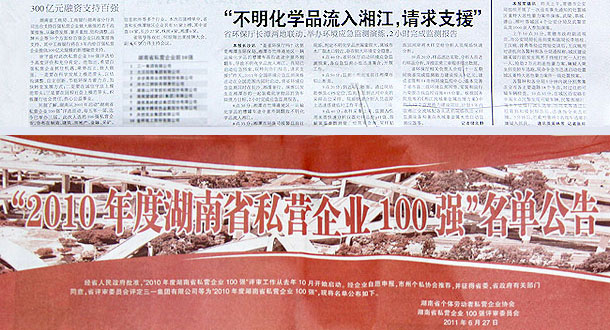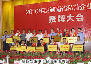 2011年8月16日,湖南省私營(yíng)企業(yè)100強(qiáng)授牌大會(huì)在長(zhǎng)沙隆重舉行。中共湖南省委副書記、省長(zhǎng)徐守盛、中國(guó)個(gè)體勞動(dòng)者協(xié)會(huì)會(huì)長(zhǎng)甘國(guó)屏、省人民政府副省長(zhǎng)劉力偉、湖南省人大常委會(huì)副主任陳叔紅、湖南省政協(xié)副主席、省工商聯(lián)會(huì)長(zhǎng)何報(bào)翔等省市領(lǐng)導(dǎo)出席頒獎(jiǎng)儀式。綠之韻集團(tuán)作為湖南省重點(diǎn)企業(yè),榮耀晉升“2010年度湖南省私營(yíng)企業(yè)100強(qiáng)”行列,胡國(guó)安董事長(zhǎng)應(yīng)邀出席頒獎(jiǎng)儀式,得到了省市各級(jí)領(lǐng)導(dǎo)的肯定和贊許。