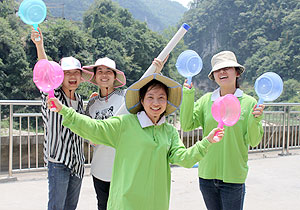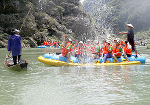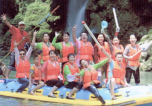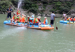 在胡國安董事長(zhǎng)的率領(lǐng)下,伙伴們浩浩蕩蕩前往素有“天下第一漂”美譽(yù)的猛洞河漂流。大家搶購著水槍、水瓢、雨衣等打水仗的武器,懷著渴望刺激挑戰(zhàn)驚險(xiǎn)的心情互相挑釁,只見河中水花飛舞、水柱橫飛,還未等上船伙伴們就紛紛“濕身”了。拐一百五十五個(gè)彎,在一百三十三個(gè)灘潭中穿梭而行,兩岸怪石嶙峋,野猴出沒,飛瀑激流,山與水的組合,讓許多來自北方的營(yíng)銷精英大呼過癮。來自葫蘆島的65歲的韓秀芝老太,端著水槍,握著水瓢,與伙伴們暢快淋漓地酣戰(zhàn),她說:真是太過癮了,人生難得有幾回這樣的機(jī)會(huì),我一定要帶領(lǐng)更多的伙伴來挑戰(zhàn)猛洞河!