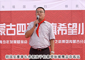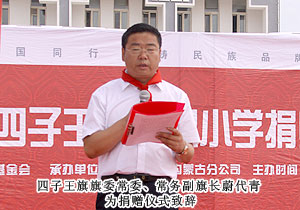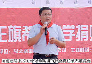 捐贈儀式現(xiàn)場,上百名綠之韻愛心精英共舞《中國人》,昂揚的氣勢,莊嚴的氛圍震撼全場。因為同是中國人,同在藍天下,所以我們更要像孟子所希望的一樣“老吾老以及人之老,幼吾幼以及人之幼”,奉獻自己力所能及的愛心,為社會輸送溫暖,讓感動在每一個人的心中升溫。少先隊員為蒞臨現(xiàn)場的領(lǐng)導和嘉賓敬獻紅領(lǐng)巾,那一抹鮮紅代表著光榮,代表著感恩,它在每一位愛心人士的胸前飄揚,讓綠之韻人的責任更加重大。四子王旗常委、常務副旗長蔚代青致歡迎辭,對綠之韻集團的大愛無疆表示誠摯的謝意和肯定。胡國安董事長發(fā)言,他表示:教育是立國之本,作為優(yōu)秀的企業(yè)公民,綠之韻始終堅持“企業(yè)做大了就是屬于國家、屬于社會的”這一社會責任理念,為捐建38所綠之韻希望小學的目標堅持不懈。草原是雄鷹的故鄉(xiāng),作為同樣從大山里走出來的孩子,胡國安董事長深深知道每一個孩子心中的夢想,希望孩子們能像鷹一樣,在學習中志存高遠,鷹擊長空。