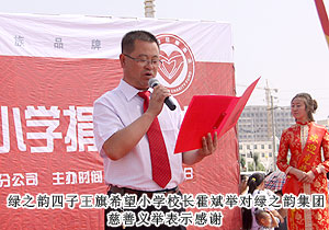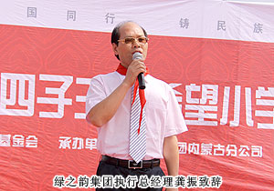 2011年7月20日,位于內(nèi)蒙古自治區(qū)烏蘭察布市的四子王旗熱鬧非凡--綠之韻四子王旗希望小學在此舉行隆重的捐贈儀式。內(nèi)蒙古自治區(qū)青少年發(fā)展基金會秘書長劉建忠、四子王旗旗委、常務副旗長蔚代青、政協(xié)副主席于有升、四子王旗工商局局長董明、副局長賈晉峰等政府領(lǐng)導及各界媒體嘉賓蒞臨,綠之韻集團董事長胡國安、執(zhí)行總經(jīng)理龔振、綠之韻慈善基金總執(zhí)行戴曉彥不遠萬里趕赴捐贈現(xiàn)場,內(nèi)蒙古分公司經(jīng)理候立新、內(nèi)蒙古地區(qū)愛心大使代表王連坤、郝建兵、張聞英以及2000余名綠之韻愛心大使參與愛心傳遞。