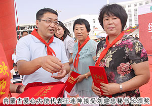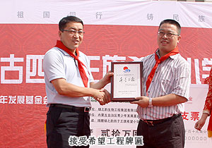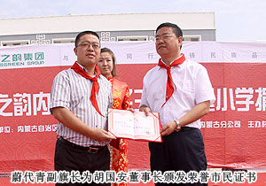 胡國安董事長向內(nèi)蒙古自治區(qū)青基會秘書長劉建忠遞交二十萬捐贈支票,并接受希望工程牌匾。劉建忠秘書長發(fā)表講話,向勇于承擔社會責任的綠之韻集團和全體營銷精英致上誠摯敬意。四子王旗常委、常務副旗長蔚代青與胡國安董事長共同為希望小學揭牌,并向胡國安董事長頒發(fā)榮譽市民證書。青基會秘書長劉建忠和執(zhí)行總經(jīng)理龔振給愛心經(jīng)銷商頒發(fā)證書,整個活動現(xiàn)場人潮洶涌,彌漫著感恩與關(guān)愛,孩子們精彩的節(jié)目表演將揭牌儀式活動推向了高潮,現(xiàn)場所有精英心懷感動,愿意盡自己的能力獻出更多關(guān)愛和溫暖。龔總在致辭中說:在綠之韻八年的發(fā)展中,綠之韻慈善基金在教育、幫扶、救災、助學等方面作出的公益事業(yè)投入累計已近2000萬元,是每一位愛心綠之韻精英的點滴匯聚才有了公司萬涓成海的善舉。