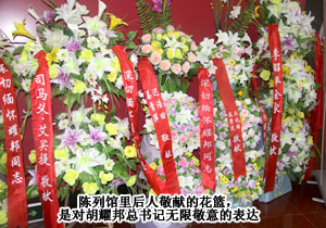 在偉大的無產(chǎn)階級(jí)革命家、政治家,原中國(guó)共產(chǎn)黨中央委員會(huì)總書記胡耀邦故居陳列館里,擺放著大大小小的花籃,那是后人對(duì)胡耀邦總書記一生“一身正氣,兩袖清風(fēng)”無限敬意的表達(dá)。中共中央政治局委員、十一屆全國(guó)人大常委會(huì)副委員長(zhǎng)、中華全國(guó)總工會(huì)主席王兆國(guó),原中華人民共和國(guó)中央軍事委員會(huì)副主席,國(guó)務(wù)委員兼國(guó)防部部長(zhǎng)遲浩田、中共湖南省委書記、省人大常委會(huì)主任周強(qiáng)等領(lǐng)導(dǎo)先后敬獻(xiàn)花籃。胡國(guó)安董事長(zhǎng)也滿懷對(duì)偉大革命家的尊敬之情敬獻(xiàn)花籃,深切緬懷胡耀邦總書記。