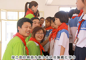 綠之韻集團秉承回饋社會的經(jīng)營理念 ,在發(fā)展中勇于承擔社會責任,從2004年捐助第一所綠之韻老屋希望小學開始就為更多的農(nóng)村孩子提供更多幫助。綠之韻集團一直也關(guān)注著留守兒童這一特殊群體,2011年5月30日,在六一國際兒童即將來臨的時候,綠之韻慈善基金總執(zhí)行戴曉彥號召湖南當?shù)氐膬?yōu)秀經(jīng)銷商們?yōu)槔衔菹MW的孩子們送上了六一節(jié)的禮物。綠之韻集團董事常務(wù)副總裁勞嘉代表集團領(lǐng)導及員工慰問了綠之韻老屋希望小學的留守兒童,并發(fā)表了講話,鼓勵孩子們要努力學習,從小學會感恩社會、感恩學校和老師,樹立起遠大的理想,爭做祖國的棟梁之才。在慰問活動中,老屋希望小學還策劃了“紅領(lǐng)巾我為你自豪”的少先隊入隊儀式,綠之韻經(jīng)銷商和員工代表一起參加了神圣而光榮的少先隊員入隊儀式,并榮幸的為新隊員佩戴紅領(lǐng)巾,祝愿新老隊員能相互幫助共同進步。綠之韻老屋希望小學的校長也為綠之韻長期以來關(guān)注教育關(guān)愛青少年兒童的成長表示了真摯的感謝。