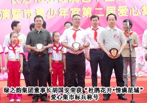 為慶?!傲弧眹H兒童節(jié)的到來,2011年5月28日,由長(zhǎng)沙市委組織部、市委宣傳部、市文明辦、團(tuán)市委、市少工委、市教育局聯(lián)合舉辦的“杜鵑花開?情滿星城”小杜鵑藝術(shù)團(tuán)慶“六一”文藝義演暨市青少年宮第二屆愛心集市大型公益活動(dòng),在長(zhǎng)沙市青少年宮舉行。各級(jí)政府領(lǐng)導(dǎo)以及社會(huì)各界的1000多名愛心人士與全市各區(qū)縣(市)近200名殘疾兒童、孤兒、困難家庭子女、農(nóng)村留守兒童、農(nóng)民工子女共同慶祝屬于孩子們的歡樂節(jié)日。綠之韻集團(tuán)董事長(zhǎng)胡國安作為長(zhǎng)沙市優(yōu)秀青年企業(yè)家代表受邀出席活動(dòng),并榮獲“杜鵑花開?情滿星城”愛心集市標(biāo)兵榮譽(yù)獎(jiǎng)牌。
