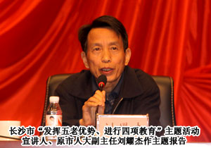 2011年4月22日,為進(jìn)一步改進(jìn)和加強(qiáng)思想政治工作,促進(jìn)和實(shí)現(xiàn)社會(huì)和諧穩(wěn)定,由長(zhǎng)沙市委組織部、市委宣傳部、團(tuán)市委聯(lián)合主辦的“傳承光榮傳統(tǒng)?爭(zhēng)當(dāng)時(shí)代先鋒”全市各界青年學(xué)習(xí)“五老”精神專題報(bào)告會(huì)在長(zhǎng)沙人民會(huì)堂舉行。邀請(qǐng)老干部、老模范、老教師、老戰(zhàn)士和老專家進(jìn)企業(yè)、進(jìn)學(xué)校、進(jìn)社區(qū)、進(jìn)機(jī)關(guān),進(jìn)行形勢(shì)政策、黨的歷史、思想道德和公民意識(shí)教育。據(jù)悉,該活動(dòng)也是團(tuán)市委紀(jì)念五四運(yùn)動(dòng)92周年系列活動(dòng)之一。