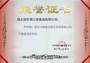 2011年“3?15”國際保護(hù)消費(fèi)者權(quán)益日之際,中國保護(hù)消費(fèi)者基金會(huì)根據(jù)《消費(fèi)者權(quán)益保護(hù)法》所賦予的職能和職責(zé),以“誠信、維權(quán)”為年度消費(fèi)主題而組織的“全國市場放心消費(fèi)單位”評(píng)比活動(dòng)揭榜。綠之韻集團(tuán)認(rèn)真貫徹執(zhí)行《消費(fèi)者權(quán)益保護(hù)法》、《產(chǎn)品質(zhì)量法》,嚴(yán)格按照國家的行業(yè)規(guī)定與質(zhì)量標(biāo)準(zhǔn)組織生產(chǎn),經(jīng)過活動(dòng)組織方及國家相關(guān)部門的層層審查,被中國保護(hù)消費(fèi)者基金會(huì)授予“全國市場放心消費(fèi)單位”。