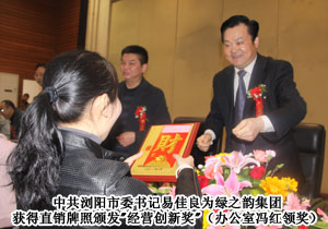 2011年3月10日,長沙國家生物產(chǎn)業(yè)基地經(jīng)濟(jì)工作會議在瀏陽市行政中心隆重召開。中共長沙市委常委、瀏陽市委書記易佳良、長沙市人民政府副市長何寄華、湖南省科技廳副廳長羅亞軍等省市級政府領(lǐng)導(dǎo)出席會議并發(fā)表重要講話。綠之韻集團(tuán)榮獲“2010年度稅收過千萬企業(yè)”“經(jīng)營創(chuàng)新獎”“目標(biāo)管理一等獎”“統(tǒng)計工作先進(jìn)單位” 多項殊榮;綠之韻迪博制藥有限公司在2010年獲評“湖南省著名商標(biāo)”獲得“名牌產(chǎn)品獎”。綠之韻員工陳英、易利群榮獲“2010年度統(tǒng)計工作先進(jìn)個人”。綠之韻集團(tuán)董事長胡國安出席領(lǐng)獎并接受產(chǎn)業(yè)基地下達(dá)的2011年目標(biāo)管理任務(wù)書。