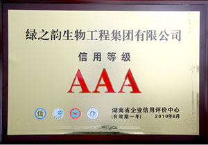 為進一步推進湖南誠信體系建設,加快形成守信激勵和失信懲戒機制,由湖南省工商聯(lián)企業(yè)服務中心與湖南省企業(yè)信用評價中心組織對全省工商企業(yè)進行了信用評價,將企業(yè)分為AAA、AA、A、BBB、BB、B、C等七級。經(jīng)過嚴格的審核,綠之韻生物工程集團有限公司以95分以上的綜合信用總評分被評定為湖南省“企業(yè)信用AAA級單位”。