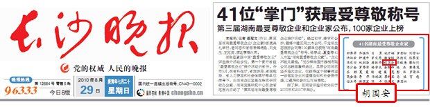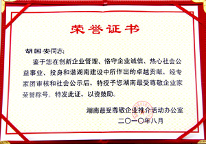 2010年8月28日,由湖南省科技廳、湖南省國家稅務(wù)局、湖南企業(yè)發(fā)展調(diào)研辦公室、湖南發(fā)展研究中心等單位聯(lián)合舉辦的"第三屆湖南最受尊敬企業(yè)推介"頒獎(jiǎng)盛典暨新聞通報(bào)會(huì)在湖南蓉園賓館舉行。湖南省人大常委會(huì)黨組成員、省政府顧問唐之享、原湖南省委書記熊清泉、原湖南省政協(xié)主席劉夫生等老領(lǐng)導(dǎo)出席本次頒獎(jiǎng)活動(dòng)?!逗先?qǐng)?bào)》、《瀟湘晨報(bào)》、紅網(wǎng)、長沙新聞?lì)l道等多家媒體對(duì)本次評(píng)選給予高度關(guān)注。綠之韻集團(tuán)榮獲“湖南最受尊敬企業(yè)”榮譽(yù)稱號(hào),胡國安董事長被授予“湖南最受尊敬企業(yè)家”榮譽(yù)稱號(hào)。