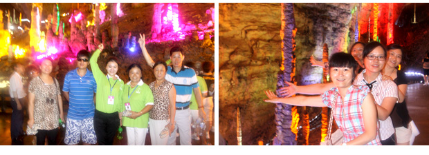 游覽享有“世界溶洞全能冠軍”之稱的黃龍洞景區(qū),伙伴們再一次被大自然深深震撼:洞中燈火闌珊、石筍林立,猶如一株株古木錯節(jié)盤根、洞中有洞、洞中有河、無奇不有,真乃名副其實的“地下魔宮”! 洞內有迷宮、響水河、天仙水、天柱街、龍宮等六大景區(qū),長廊蜿蜒,鐘乳懸浮,石柱石筍林立,還有石簾、石幔、石花、石琴,琳瑯滿目,異彩紛呈。更讓人感到新鮮別致的是那色澤,紅、藍、青、綠、黃、白、紫,重重疊疊,絢麗多彩,滿目珠璣,令人眼花潦亂。山的腹地,濃縮著如此美麗的景致,被精雕細刻的如此晶瑩、閃亮,伙伴們被這種神奇的力量所感染,靜靜地欣賞著,不錯過任何一處的精彩。