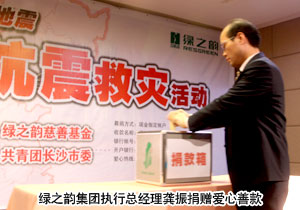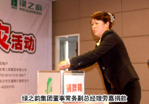 2010年4月18日,綠之韻集團(tuán)“情系玉樹?共筑家園”抗震救災(zāi)捐款活動(dòng)在綠之韻國(guó)際大酒店貴賓樓舉辦,聯(lián)合長(zhǎng)沙市青少年發(fā)展基金會(huì)向?yàn)?zāi)區(qū)捐贈(zèng)了第一筆愛心善款——30萬(wàn)元現(xiàn)金及物資。共青團(tuán)長(zhǎng)沙市委副書記彭勇、長(zhǎng)沙市青少年發(fā)展基金會(huì)秘書長(zhǎng)羊舒麟代表災(zāi)區(qū)現(xiàn)場(chǎng)接受捐贈(zèng)。長(zhǎng)沙市新聞?lì)l道、長(zhǎng)沙晚報(bào)等新聞媒體出席會(huì)議并現(xiàn)場(chǎng)報(bào)道捐款情況。綠之韻集團(tuán)董事常務(wù)副總經(jīng)理勞嘉、執(zhí)行總經(jīng)理龔振、市場(chǎng)總監(jiān)諶獻(xiàn)軍等集團(tuán)高管與集團(tuán)總部、國(guó)際大酒店、迪博制藥廠的員工代表、第二十九屆區(qū)域(高級(jí))經(jīng)理以及湖南地區(qū)分銷商代表現(xiàn)場(chǎng)踴躍捐款。胡國(guó)安董事長(zhǎng)雖身在異地,但仍通過(guò)總裁辦捐助愛心善款,并表達(dá)了對(duì)災(zāi)區(qū)同胞的關(guān)懷和鼓勵(lì)。