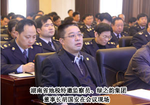 2010年3月31日,湖南省地稅系統(tǒng)領導班子暨黨風廉政建設工作會議在長沙市金輝大酒店召開。此次會議重點在于回顧2009年全系統(tǒng)黨風廉政建設和反腐敗工作并表彰先進,明確2010年反腐倡廉任務。湖南省地稅局黨組書記、局長呂興勝、湖南省地稅局常務副局長張云英、湖南省紀委副書記趙均田等領導出席會議,湖南省地稅特邀監(jiān)察員、綠之韻集團董事長胡國安受邀出席。