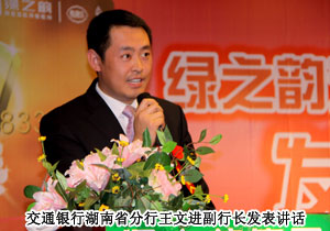 交通銀行湖南分行王文進副行長發(fā)表講話,他說“交通銀行|綠之韻聯(lián)名卡”的發(fā)行是我省銀企合作的一件大事,雙方合作不僅是對彼此品牌的高度認同,而且對雙方的文化建設也會起到強有力的推動作用,他希望雙方的合作不斷向縱深發(fā)展,取得更加豐碩的成果。