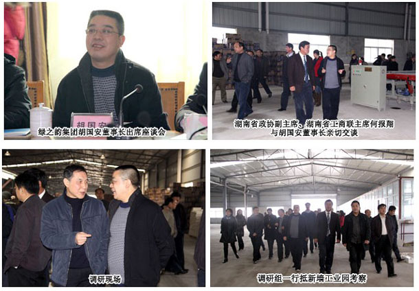 2010年1月4日,在湖南省政協(xié)副主席、湖南省工商聯(lián)主席何報翔、省工商聯(lián)副主席、黨組成員周柏良的帶領(lǐng)下,省政協(xié)委員、省工商聯(lián)常委、綠之韻集團董事長胡國安及湖南省部分知名民營企業(yè)家赴湖南省岳陽縣就招商引資工作進行實地考察。