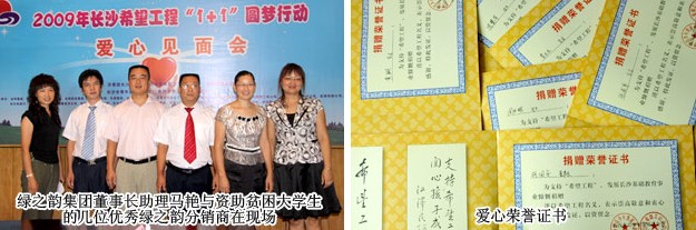 8月28日,湖南省長沙市青少年宮內洋溢著濃濃的愛心——在綠之韻慈善基金及綠之韻湖南分公司的組織下,以大學生影響小學生“綠之韻樹人行動”全國第三站暨共青團長沙市委“2009長沙希望工程圓夢行動”愛心見面會在此舉行。共青團長沙市委副書記彭勇、長沙市青年企業(yè)家協(xié)會秘書長高溈鋒、長沙市青年聯(lián)合會副秘書長楊溶、長沙市青少年發(fā)展基金會副秘書長羊舒麟等領導,以及綠之韻集團董事長助理、慈善基金秘書長馬艷、綠之韻愛心分銷商張建軍、黃翔、周書明、沈慧芳、李正元出席會議并捐贈愛心款項。此次行動以“一幫幾”的結對幫扶形式向近200名貧困準大學生發(fā)放55萬元助學款,用愛心托起了他們的大學夢。綠之韻集團利用樹人行動的愛心力量共幫扶了七名考上清華、北大等名校卻無力承擔學費的寒門學子。