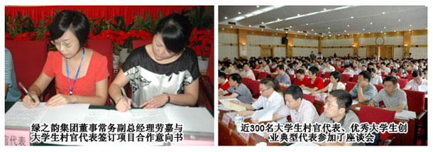 2009年8月24日至25日,湖南省大學生村官創(chuàng)業(yè)成才座談會在長沙召開。省委副書記梅克保出席會議并講話。省人大常委會黨組成員王四連、省人民政府副省長韓永文、省政協(xié)副主席何報翔、省委常委、組織部長黃建國,共青團湖南省委書記張值恒等領導出席會議,綠之韻集團董事常務副總經(jīng)理勞嘉受邀出席。據(jù)介紹,本次座談會由共青團湖南省委、省委基層辦組織的,湖南省大學生村官代表、優(yōu)秀大學生創(chuàng)業(yè)典型代表近300人參加了座談會。