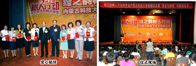 2009年5月24日晚上19時(shí)30分,內(nèi)蒙古科技大學(xué)禮堂內(nèi)座無(wú)虛席,由綠之韻慈善基金聯(lián)合內(nèi)蒙古青少年基金會(huì)、內(nèi)蒙古科技大學(xué)主辦的綠之韻樹(shù)人行動(dòng)全國(guó)第二站捐贈(zèng)儀式暨責(zé)任與夢(mèng)想的專(zhuān)題報(bào)告會(huì)在這里隆重舉行。
