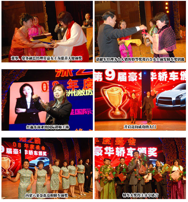 隨著節(jié)目的層層推進(jìn),舞臺(tái)電子屏幕播放了綠之韻形象店、歷屆拿車(chē)慶典的VCR,“2008年度個(gè)人零售業(yè)績(jī)獎(jiǎng)、2008年度店鋪銷(xiāo)售業(yè)績(jī)前十名”頒獎(jiǎng)典禮…………把現(xiàn)場(chǎng)氣氛推向了高潮。年會(huì)頒獎(jiǎng)典禮上最大的亮點(diǎn)是首次設(shè)置的鉆石勛章獎(jiǎng),47位業(yè)績(jī)驕人的分銷(xiāo)精英獲得了鐫刻有自己名字,從兩星至五星不等的純金鑲鉆榮譽(yù)勛章。閃爍的燈光下,最激動(dòng)人心的綠之韻集團(tuán)第九屆豪華轎車(chē)大獎(jiǎng)的得主依次登臺(tái)領(lǐng)獎(jiǎng)。年會(huì)上,紅遍東南亞的金牌講師、亞洲八大名師中唯一的女性講師王琳在舞臺(tái)上,為現(xiàn)場(chǎng)的綠之韻分銷(xiāo)精英帶來(lái)了一堂超越夢(mèng)想的精彩演講。王琳老師在臺(tái)上揮灑自如的風(fēng)采,妙語(yǔ)連珠的智慧和繪聲繪聲的演繹,讓參會(huì)精英們?cè)诖箝_(kāi)眼界的同時(shí),更享受了一次全新的精神洗禮。