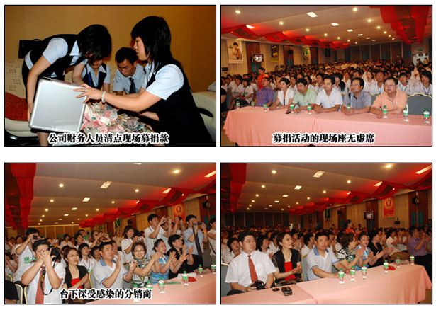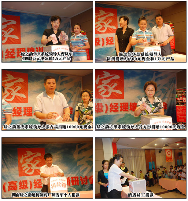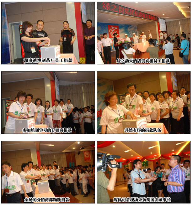 而綠之韻集團(tuán)總部通過共青團(tuán)長沙市委、長沙市青年企業(yè)家協(xié)會的聯(lián)絡(luò)與長沙市青少年發(fā)展基金會、長沙市血液中心組織現(xiàn)場捐款和義務(wù)獻(xiàn)血活動。17日下午13點(diǎn)30分,綠之韻“眾志成城 抗震救災(zāi)”活動在綠之韻集團(tuán)中國總部舉行,共青團(tuán)長沙市委副書記、長沙市青年企業(yè)家協(xié)會常務(wù)副會長彭勇、長沙市青年企業(yè)家協(xié)會秘書長王海軍也蒞臨現(xiàn)場。隨后,由綠之韻集團(tuán)董事長兼總裁胡國安向共青團(tuán)長沙市委捐款100萬元現(xiàn)金及物資,而正在公司參加培訓(xùn)學(xué)習(xí)的200余名分銷商、湖南綠之韻迪博制藥廠員工、綠之韻國際大酒店貴賓樓員工以及公司總部員工井然有序地排隊(duì)向?yàn)?zāi)區(qū)捐款,現(xiàn)場募集現(xiàn)金138888元,共青團(tuán)長沙市委當(dāng)即將1138888元現(xiàn)金及物資轉(zhuǎn)交給長沙市青少年發(fā)展基金會。湖南電視臺、長沙電視臺、星辰在線網(wǎng)站等媒體記者對胡國安董事長進(jìn)行了現(xiàn)場采訪,胡總說:“萬涓成水,匯愛成海。在中華民族遭遇災(zāi)難的時(shí)刻,只要我們?nèi)f眾一心,眾志成城,共負(fù)國難,共渡難關(guān),我們就一定能贏得抗震救災(zāi)的最后勝利,一定能夠幫助災(zāi)區(qū)人民重建美好的家園!”