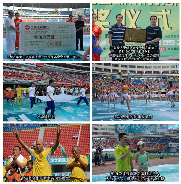 2007年5月20日下午3點,星城長沙因為遠道而來的香港明星足球隊和來自全國各地的綠之韻精英顯得更加光輝燦爛。為歡慶四周年慶典,綠之韻集團公司與香港明星足球隊攜手的“綠之韻杯善行2007三湘助學(xué)行”香港明星足球隊(長沙)大型公益賽”在賀龍體育中心隆重進行。這是一場由共青團湖南省委、湖南省體育局指導(dǎo),湖南省青少年發(fā)展基金會主辦、綠之韻集團全程支持的以助學(xué)為宗旨,以推動我省農(nóng)村青年文化扶貧計劃為主旋律的大型公益活動。湖南省人大常委會副主任王四連女士、共青團湖南省委副書記張值恒先生為本次賽事致辭,共青團湖南省委副書記陳雪楚、湖南省文化廳廳長金則恭、湖南省體育局副局長熊倪、湖南省青少年發(fā)展基金會理事長李克勛、中共長沙市委常委、市政府常務(wù)副市長向力力、長沙市人大副主任張菊平 、長沙市政府副市長曹亞等政府領(lǐng)導(dǎo)也親臨球賽現(xiàn)場。慈善與體育的水乳交融,明星與精英的交相輝映,讓整個賽場呈現(xiàn)出令人振奮的萬千姿彩。綠茵場上,這場在善行的大旗下,以愛心的名義舉行的公益足球賽,由湖南省青少年發(fā)展基金會理事長李克勛先生和綠之韻集團董事長胡國安先生共同為比賽開球。香港明星足球隊與綠之韻善行聯(lián)隊的對抗精彩紛呈。譚詠麟、陳百強、黃日華、羅家英等明星在球場上同樣風(fēng)采照人?;盍λ纳涞淖闱?qū)氊愋?、賽事中場香港著名歌星左筠、影星羅家英和炙手可熱的超女唐笑等相繼一展美妙歌喉的精彩表演讓現(xiàn)場觀眾熱情高漲