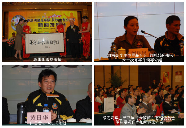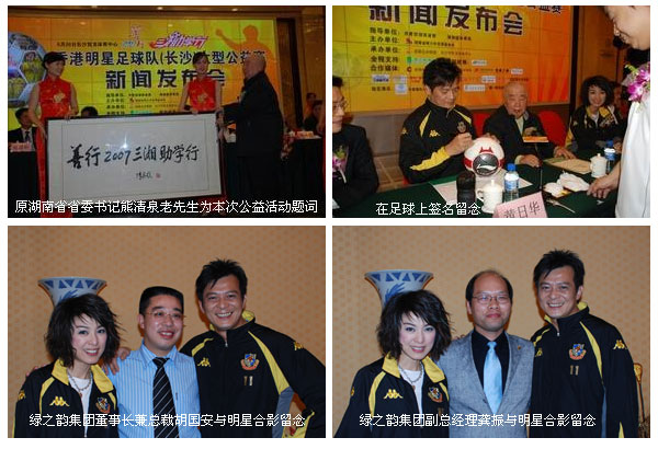2007年4月26日下午三點(diǎn),由湖南省青少年發(fā)展基金會(huì)主辦,綠之韻集團(tuán)全程支持的“綠之韻杯善行2007·綠之韻三湘助學(xué)行”香港明星足球隊(duì)(長(zhǎng)沙)大型公益賽新聞發(fā)布會(huì)在華雅國(guó)際大酒店隆重召開。原湖南省省委書記熊清泉擔(dān)任活動(dòng)名譽(yù)顧問,共青團(tuán)湖南省團(tuán)委副書記張值恒、湖南省體育局副局長(zhǎng)熊倪等出席了新聞發(fā)布會(huì),綠之韻集團(tuán)董事長(zhǎng)兼總裁胡國(guó)安先生、香港明星足球隊(duì)領(lǐng)隊(duì)及代表黃日華、米雪、尹志強(qiáng)和湖南愛心聯(lián)隊(duì)領(lǐng)隊(duì)王可維出席會(huì)議并分別發(fā)表講話。湖南省的電視、報(bào)紙、雜志、電臺(tái)、網(wǎng)絡(luò)等30多家媒體到現(xiàn)場(chǎng)采訪。綠之韻集團(tuán)第三屆(分銷商)咨詢管理委員會(huì)的50多位候補(bǔ)委員們亦受邀參加新聞發(fā)布會(huì)為活動(dòng)助興。