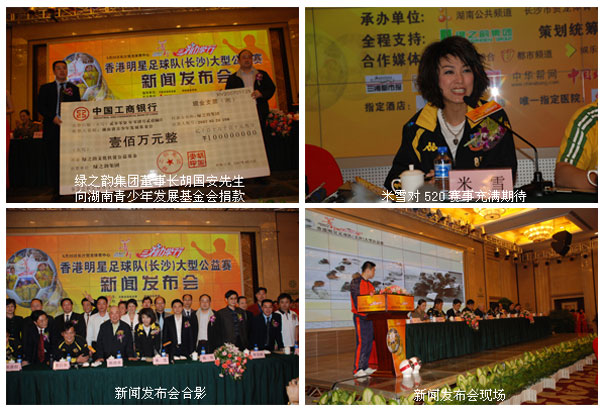 新聞發(fā)布會(huì)上,湖南省青少年發(fā)展基金會(huì)秘書長(zhǎng)劉鳳娟對(duì)本次賽事進(jìn)行了簡(jiǎn)要介紹,并重點(diǎn)就綠之韻集團(tuán)熱心公益的慈善義舉表示贊許。本次公益賽事活動(dòng)定于2007年5月20日下行三點(diǎn)在長(zhǎng)沙市賀龍?bào)w育中心舉行,香港隊(duì)將由譚詠麟、曾志偉、任達(dá)華等明星領(lǐng)銜出場(chǎng),對(duì)決由綠之韻集團(tuán)組成的綠之韻愛心聯(lián)隊(duì),本次活動(dòng)心系貧困兒童,關(guān)注山區(qū)教育事業(yè),綠之韻集團(tuán)所籌善款將全部贈(zèng)予湖南省青少年發(fā)展基金會(huì),致力于幫助全國(guó)各地貧困兒童重回課堂。