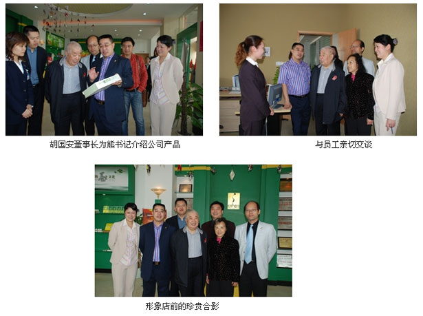 2007年4月15日,原湖南省委書記熊清泉攜其夫人蒞臨綠之韻集團(tuán)考察指導(dǎo)工作?!吧菩?007、三湘助學(xué)行”香港明星足球隊(duì)(長(zhǎng)沙)大型公益義演賽組委會(huì)總顧問、綠之韻集團(tuán)董事長(zhǎng)兼總裁胡國(guó)安先生,綠之韻集團(tuán)董事、執(zhí)行總經(jīng)理陳社行先生,董事、常務(wù)副總經(jīng)理勞嘉女士,綠之韻國(guó)際集團(tuán)(東南亞)股份有限公司執(zhí)行總經(jīng)理龔振先生對(duì)老書記的到來表示了最熱烈的歡迎。并親自陪同老領(lǐng)導(dǎo)進(jìn)行了詳細(xì)實(shí)察。