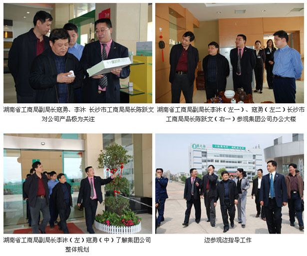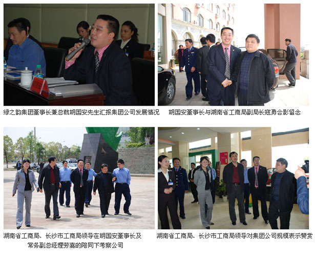 2007年4月11日,湖南省工商局副局長寇勇、李沐,長沙市工商局局長陳躍文等帶領(lǐng)省、市工商局市場處、外資處、商標(biāo)廣告監(jiān)督管理處、注冊局等40余名領(lǐng)導(dǎo)深入湖南瀏陽生物醫(yī)藥園,對公司進(jìn)行了調(diào)研考察。省、市工商局調(diào)研組一行首先在瀏陽生物醫(yī)藥園管委會政務(wù)廳聽取了瀏陽工商局、管委會領(lǐng)導(dǎo)以及綠之韻集團(tuán)董事長兼總裁胡國安先生的工作匯報。