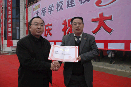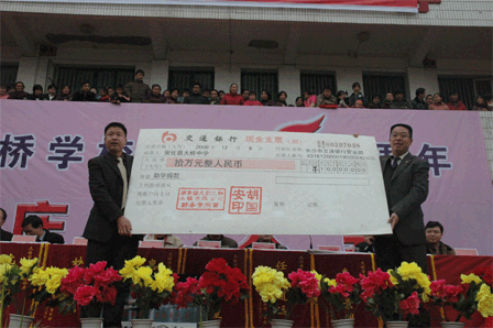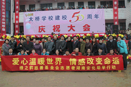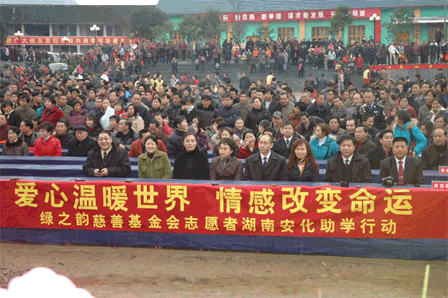 胡國(guó)安董事長(zhǎng)代表綠之韻集團(tuán)出資十萬(wàn)元捐助了第四所綠之韻大橋希望中學(xué),這也是綠之韻集團(tuán)公司繼2006年5月28日在黑龍江省佳木斯市捐助了第三所綠之韻珠山希望小學(xué)后的又一次慈善義舉。本次捐贈(zèng)得到了當(dāng)?shù)馗咐相l(xiāng)親擁護(hù)的同時(shí)也得到湖南安化縣政府和教育局的高度贊譽(yù),并授予胡國(guó)安集董事長(zhǎng)為湖南安化冷市鎮(zhèn)大橋?qū)W校“榮譽(yù)校長(zhǎng)”、安化縣“榮譽(yù)市民”的稱號(hào)。綠之韻優(yōu)秀經(jīng)銷商柳紅先、張吉福夫婦、李平、谷方彤、韓曉鳴以及綠之韻金航系統(tǒng)的部分代表作為綠之韻慈善基金會(huì)志愿者參加了此次活動(dòng)。曹鳳華、柳紅先、張吉福夫婦、李平、谷方彤、廉淇夫婦、王愛(ài)麗、浦守仁夫婦、韓曉鳴、呂艷玲等人慷慨解囊,為大橋中學(xué)捐款,紛紛被安化縣政府授予“榮譽(yù)市民”稱號(hào)和大橋?qū)W?!皭?ài)心使者”的稱號(hào)。