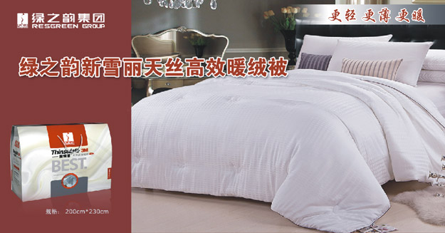 綠之韻集團(tuán)與世界500強(qiáng)企業(yè)3M公司強(qiáng)強(qiáng)聯(lián)手推出高科技被芯——綠之韻新雪麗天絲高效暖絨被。此款被芯使用的是市場上熱重效率最高的合成保溫材料,利用被芯形成具有高吸附空氣性能的空間結(jié)構(gòu),從而阻止人體熱量通過空氣對(duì)流散失,同時(shí)反射回大部分的人體熱輻射,這樣就保障了人體熱量盡可能少的損失。且3M公司的新雪麗保溫材料就是為了可以承受地球上最苛刻的環(huán)境條件才研制出來的,因此從它誕生起就比一般的保溫材料更保暖。實(shí)驗(yàn)證明,在相同重量的情況下,要多550克羽絨作為填充料,才能達(dá)到這樣一款新雪麗暖絨被的保暖效果,這也直接解決冬天蓋被臃腫的難題。