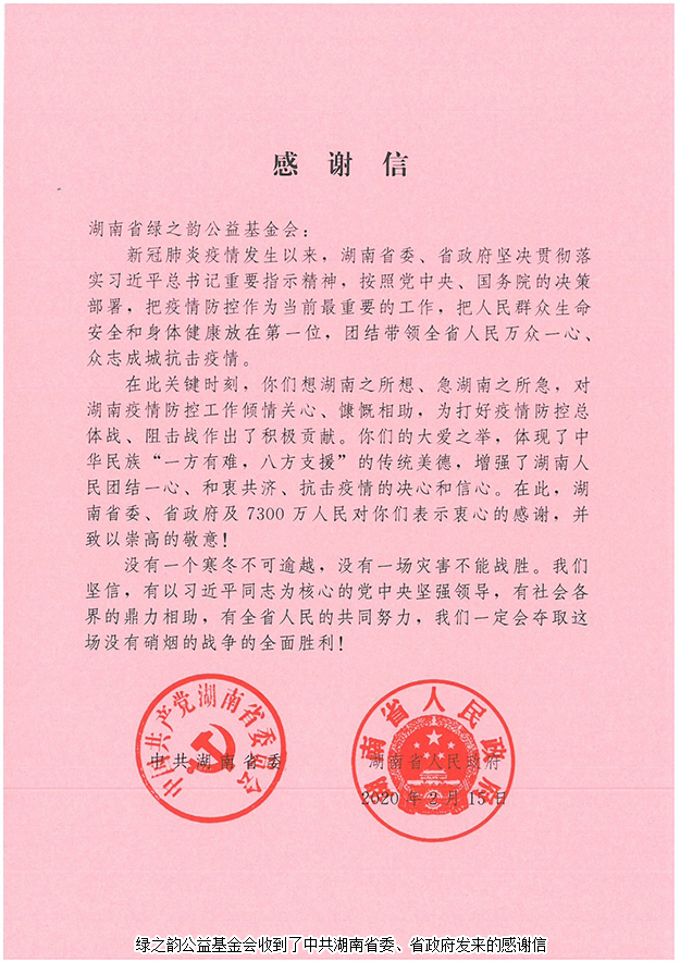 在聽取完勞嘉總裁的工作匯報(bào)后,湖南省政協(xié)副主席、致公黨湖南省委主委胡旭晟及調(diào)研組一行對綠之韻的疫情防控舉措落實(shí)工作表示了充分肯定,對綠之韻積極向湖北湖南抗擊疫情捐贈(zèng)愛心款物助力抗疫所表現(xiàn)出來的社會(huì)情懷和高度責(zé)任感給予了高度贊譽(yù)和評(píng)價(jià)。近日,綠之韻公益基金會(huì)收到了中共湖南省委、省政府發(fā)來的感謝信,信中充分肯定綠之韻為全面打贏疫情防控人民戰(zhàn)爭、總體戰(zhàn)、阻擊戰(zhàn)作出的積極貢獻(xiàn)。