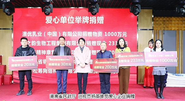 會議伊始,各市州代表就“迎新春送溫暖獻愛心”活動的開展情況上臺進行了展示。活動現(xiàn)場,愛心企業(yè)紛紛慷慨解囊,現(xiàn)場捐贈了大批愛心款物,為偏遠地區(qū)人民溫暖過冬快樂過年貢獻出自己的一份力。綠之韻集團捐贈現(xiàn)金233萬元,幫扶困難群體,助力全省脫貧攻堅。一筆筆善款、一份份愛心在現(xiàn)場匯集成愛的海洋。湖南省民政廳巡視員楊薇接受愛心企業(yè)捐贈。