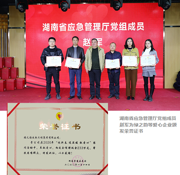 凝聚點滴力量,愛心傳遞溫暖。2020年1月14日,在農(nóng)歷新年即將到來之際,湖南省“迎新春送溫暖獻愛心”啟動儀式在長沙舉行。湖南省民政廳黨組書記、廳長唐白玉,省應急管理廳黨組成員趙軍,省民政廳巡視員楊薇、辦公室主任歐陽標、慈社處處長楊柯,省慈善總會辦公室主任丁紹干,省民政廳福彩中心主任曾波彥以及各市州代表出席活動。綠之韻集團向湖南省慈善總會捐贈233萬愛心款參與貧困幫扶,助力脫貧攻堅??偛弥?、綠之韻公益基金會秘書長蔣文受邀參加活動。