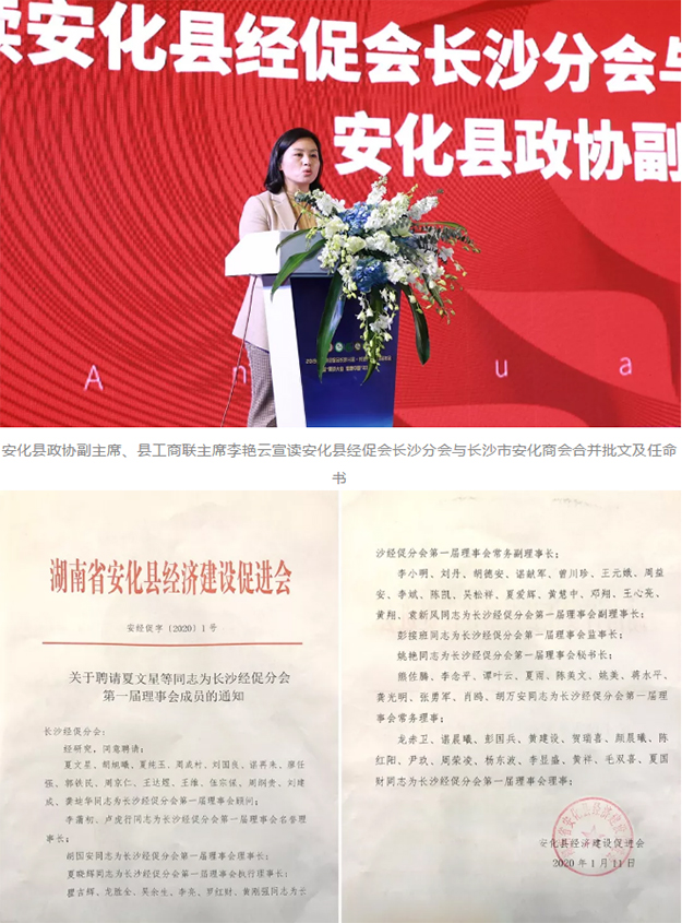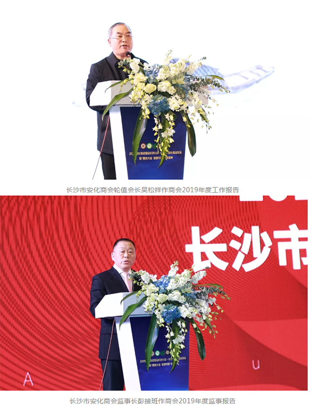 會上,長沙市安化商會輪值會長吳松祥作商會2019年度工作報(bào)告;長沙市安化商會監(jiān)事長彭接班作商會2019年度監(jiān)事報(bào)告;安化縣政協(xié)副主席、縣工商聯(lián)主席李艷云宣讀安化縣經(jīng)促會長沙分會與長沙市安化商會合并批文及任命書。其中,夏文星、胡旭曦等15名同志當(dāng)選為安化縣經(jīng)促會長沙分會第一屆理事會顧問;李蒲初、盧虎行同志當(dāng)選為安化縣經(jīng)促會長沙分會第一屆理事會名譽(yù)理事長;胡國安董事長當(dāng)選安化縣經(jīng)促會長沙分會第一屆理事會理事長。