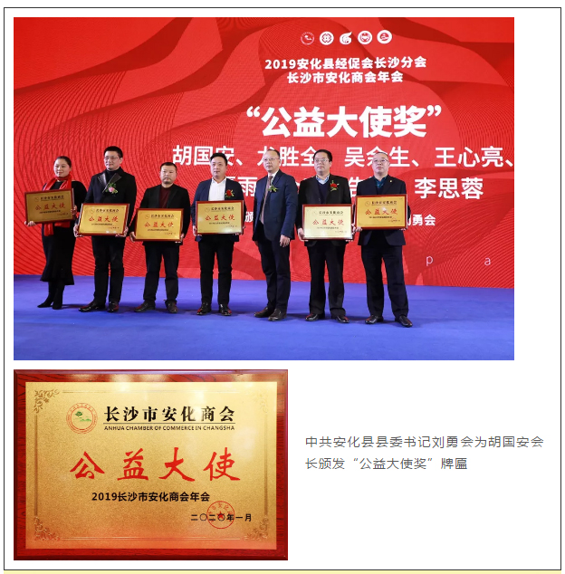 為了表彰為安化發(fā)展做出貢獻(xiàn)的會員代表,大會相繼頒發(fā)了“公益大使獎”“優(yōu)秀會員獎”“優(yōu)秀副會長獎”“特殊貢獻(xiàn)獎”等獎項(xiàng)。胡國安會長積極投身社會公益事業(yè),組織會員參加“情系家鄉(xiāng)——安化商會回鄉(xiāng)商務(wù)考察活動”;回報(bào)桑梓,踴躍參與家鄉(xiāng)扶貧濟(jì)困活動,給困難群眾送溫暖,為精準(zhǔn)扶貧工作貢獻(xiàn)力量。中共安化縣縣委書記劉勇會為胡國安會長頒發(fā)“公益大使獎”牌匾。