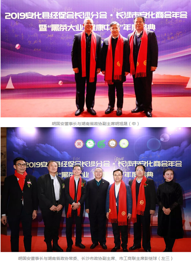 新年伊始,歲末迎春。2020年1月11日,2019安化縣經(jīng)促會長沙分會、長沙市安化商會年會暨“黑茶大業(yè) 健康中國”年度盛典在長沙隆重舉行。本次大會得到各界領(lǐng)導(dǎo)和眾多企業(yè)的高度關(guān)注和支持,湖南省政協(xié)副主席胡旭晟,湖南省軍區(qū)原副司令員黃明開,湖南省公安廳原常務(wù)副廳長胡旭曦,湖南省公安廳治安總隊(duì)政委夏曉鷗,湖南省民政廳副廳長游勁民,湖南省工商聯(lián)副主席吳曙光,湖南省政協(xié)常委、長沙市政協(xié)副主席、市工商聯(lián)主席彭繼球,長沙市工商聯(lián)副主席、市商協(xié)會組織聯(lián)合黨委書記張明剛,中國工程院院士、湖南農(nóng)業(yè)大學(xué)教授、博士生導(dǎo)師劉仲華;益陽市人民政府副市長湯瑞祥,益陽市人民政府副秘書長匡維波;中共安化縣縣委書記劉勇會,安化縣人民政府縣長肖義,安化縣政協(xié)副主席、縣工商聯(lián)主席李艷云等領(lǐng)導(dǎo)嘉賓出席會議。湖南省政協(xié)委員、湖南省工商聯(lián)(總商會)副會長、長沙市安化商會會長、綠之韻集團(tuán)董事長胡國安與長沙市安化商會全體會員、安化各大商會代表、長沙各行業(yè)安化籍知名企業(yè)和精英人士齊聚一堂,共迎未來發(fā)展新征程。