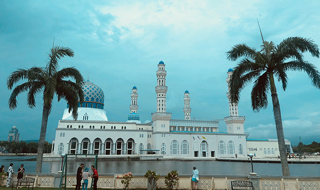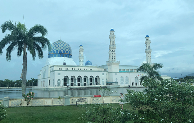 飛抵沙巴的第一天,用過(guò)豐富的早餐,家人們便來(lái)到了沙巴最著名的水上清真寺——哥達(dá)京那巴魯市立清真寺。它座落在里卡士灣畔(Likas Bay),是一座典型的當(dāng)代伊斯蘭教建筑,也是馬來(lái)西亞夕陽(yáng)景觀最壯麗的清真寺之一。清真寺建于里卡士灣的人造湖上,清真寺的四座宣禮塔和美麗的穹頂非常引人注目,白色建筑倒映在湖水中,與蔚藍(lán)天色相襯,十分震撼。